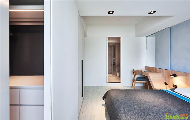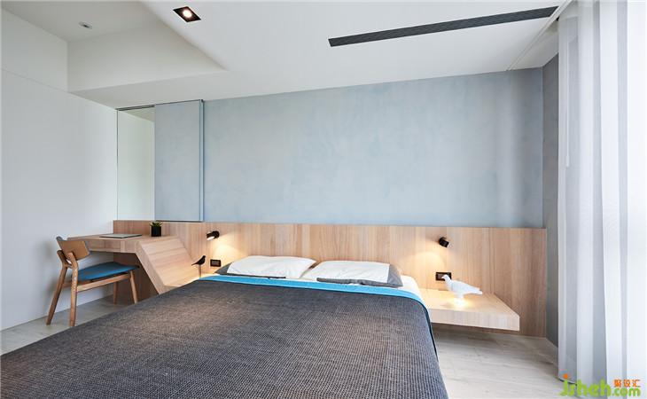 主臥床頭墻面,也是硅藻土材質(zhì)調(diào)成藍(lán)色,墻面也隱藏一個(gè)拉門(mén),拉開(kāi)底下就是鏡子功能。