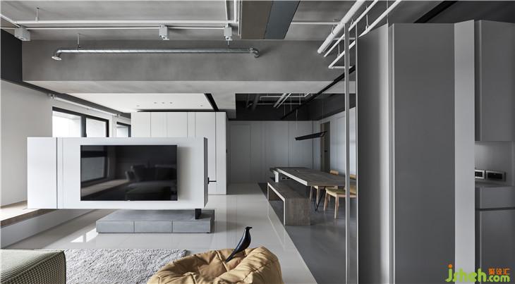 因為屋主很好客,所以我們讓這空間的主要核心就是中島,利用地坪界定兩個區(qū)塊,灰色無縫地坪隱涵著土地從入口延伸到餐廳,透過皺褶的鐵件縫隙隱約看見土地上長出的中島,區(qū)隔的白色磁磚面地坪象征水的意象,電視像是墻懸空在水面上的量體
