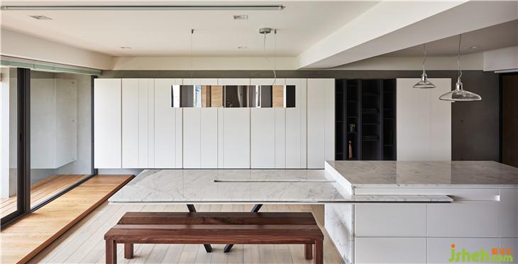 石材量體與石材桌面,利用同一塊大版石材切割,吊燈選用具有不規(guī)則皺褶面的不銹鋼燈具