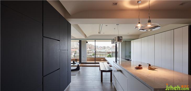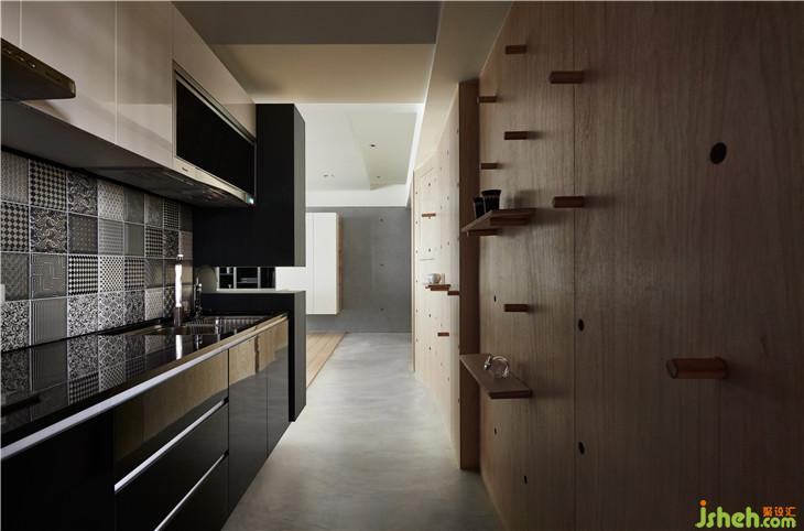 維持建筑物原有廚房位置,除了管線較不需拉過(guò)長(zhǎng),也藉由材質(zhì)與局部穿透,讓空間盡量純粹,右側(cè)黑色量體表面使用黑板漆,變成可以涂鴉或?qū)⑸罴o(jì)錄的墻面,里面也是所有廚房家電收納的空間。