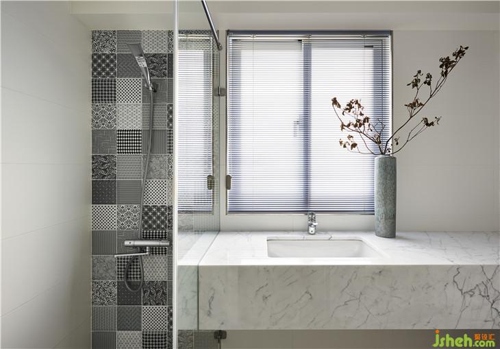 簡(jiǎn)潔的廁所空間延續(xù)外面中島的大理石臺(tái)面量體感