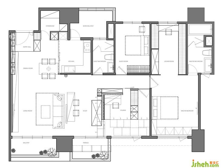 平面配置上,客廳書房為開(kāi)放式,后方黃色塊體為貓屋 ,紅色墻面為女主人的工作空間利用一個(gè)臥榻結(jié)合貓屋。