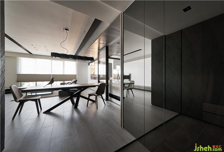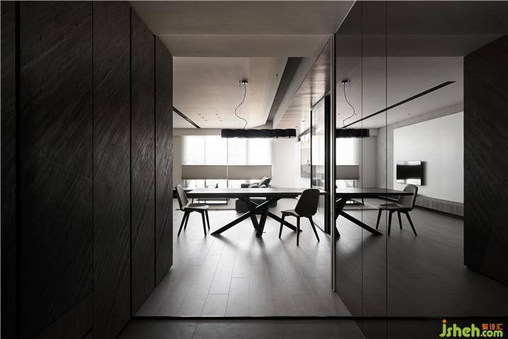 入口側(cè)墻整面的穿衣鏡使用灰鏡,大門一進(jìn)到空間就看見(jiàn)造型感強(qiáng)烈的桌子,也變成一個(gè)視覺(jué)端景。