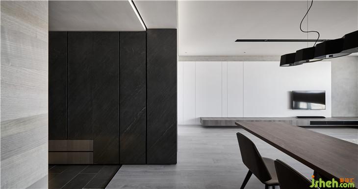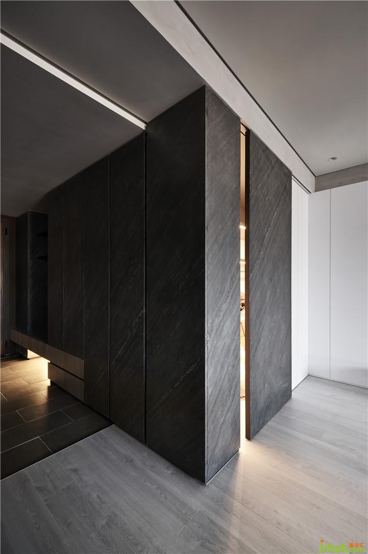 入口鞋柜一直延伸到客廳的儲(chǔ)藏室表面都貼石皮材質(zhì),雖然顏色很重,但我希望營(yíng)造一進(jìn)到這空間就像看到一個(gè)沉穩(wěn)的石材塊體,然后與客廳這一面的白墻形成視覺(jué)的強(qiáng)烈對(duì)比,當(dāng)使用者進(jìn)入這空間后因?yàn)檫@樣的情境轉(zhuǎn)換,就會(huì)有一種豁然開(kāi)朗的感覺(jué)。