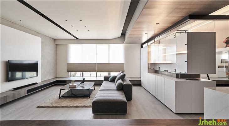 整面干凈的電視墻面,電視柜延伸到臥榻形成一個(gè)視覺(jué)延續(xù)性。