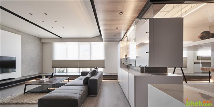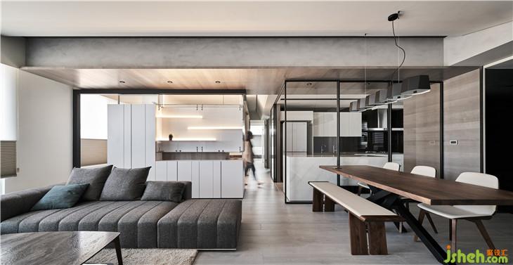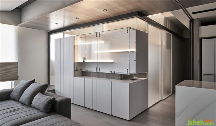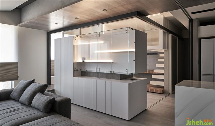 從客廳隱約看見(jiàn)前方展示柜量體后面的玻璃盒子,透過(guò)這樣的置入一個(gè)盒子的手法,改變了對(duì)于生活視角的想像,產(chǎn)生了看與被看的生活趣味。