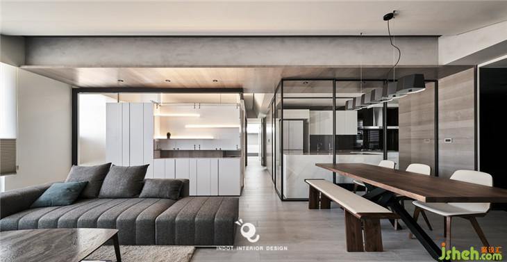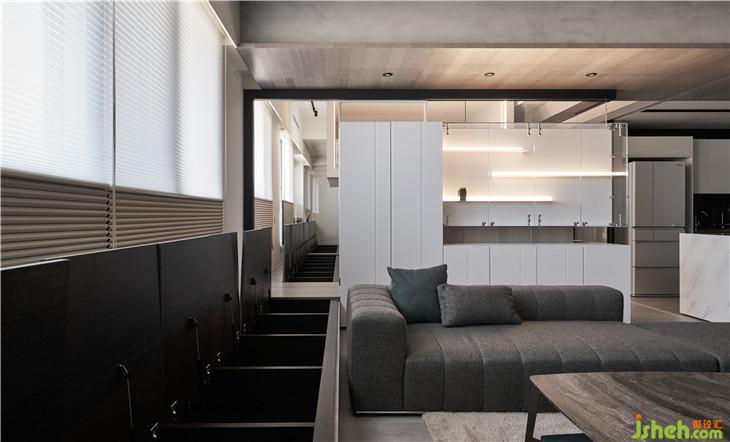 因?yàn)樘旎ǜ叩筒钜约傲旱年P(guān)系無(wú)法施作拉門軌道,所以用鐵件設(shè)計(jì)了一個(gè)軌道盒 除了可以將拉們做一個(gè)平面的整合,也可以變成一種線條延伸的造型。