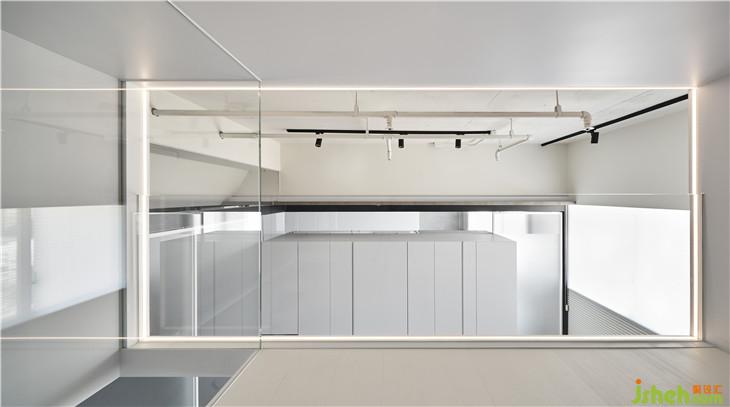 從上方光盒往外窺探的視角,透過隔間墻及不到頂?shù)墓耋w縫隙,可以看到與其他空間的使用。