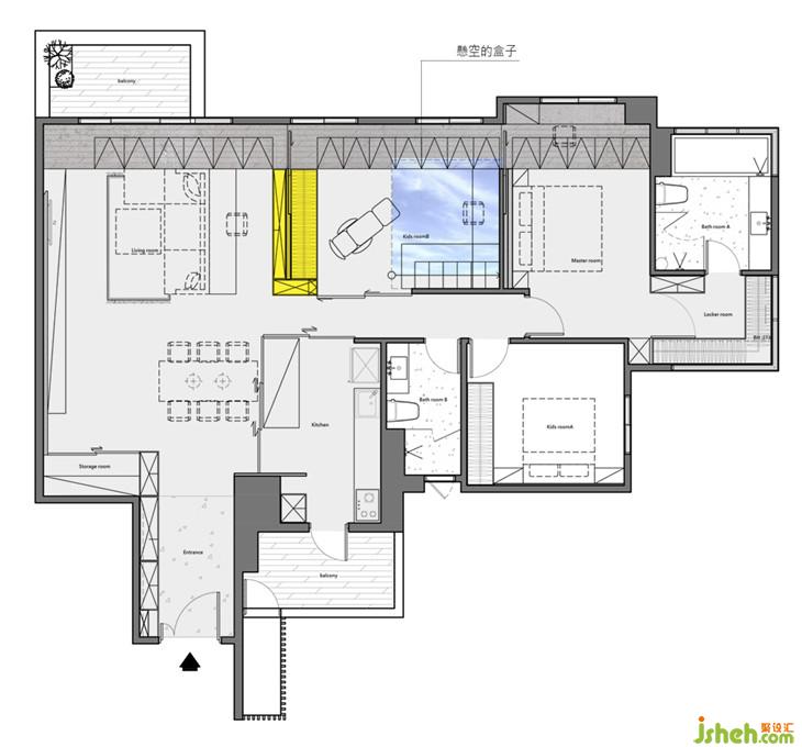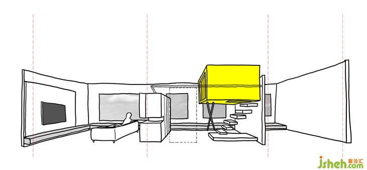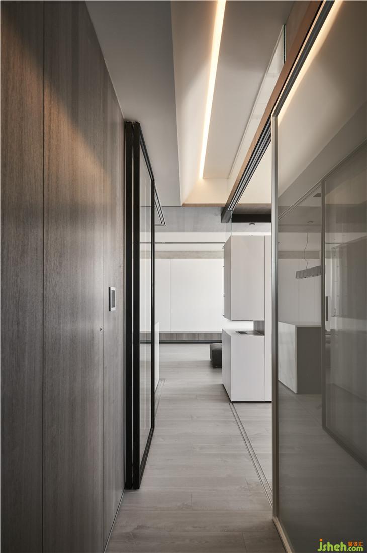 走道空間因?yàn)樯戏接写罅旱拇┻^(guò),我們沒(méi)有將它包覆,反而利用燈光及斜面的設(shè)計(jì)弱化大梁的問(wèn)題,有時(shí)候梁的問(wèn)題不一定要把它隱藏 ,露出來(lái)也有不同設(shè)計(jì)味道。