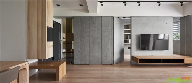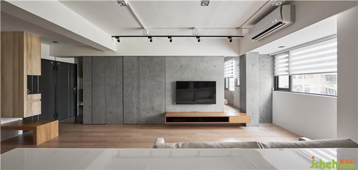 左側(cè)收納柜延伸到客廳電視墻,我們利用清水模把整面墻整合