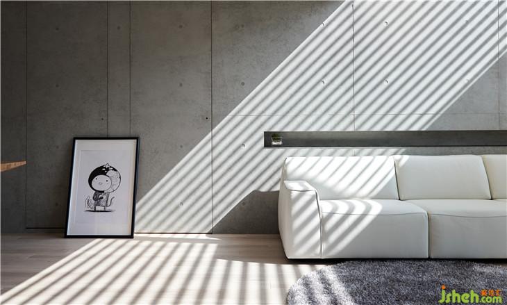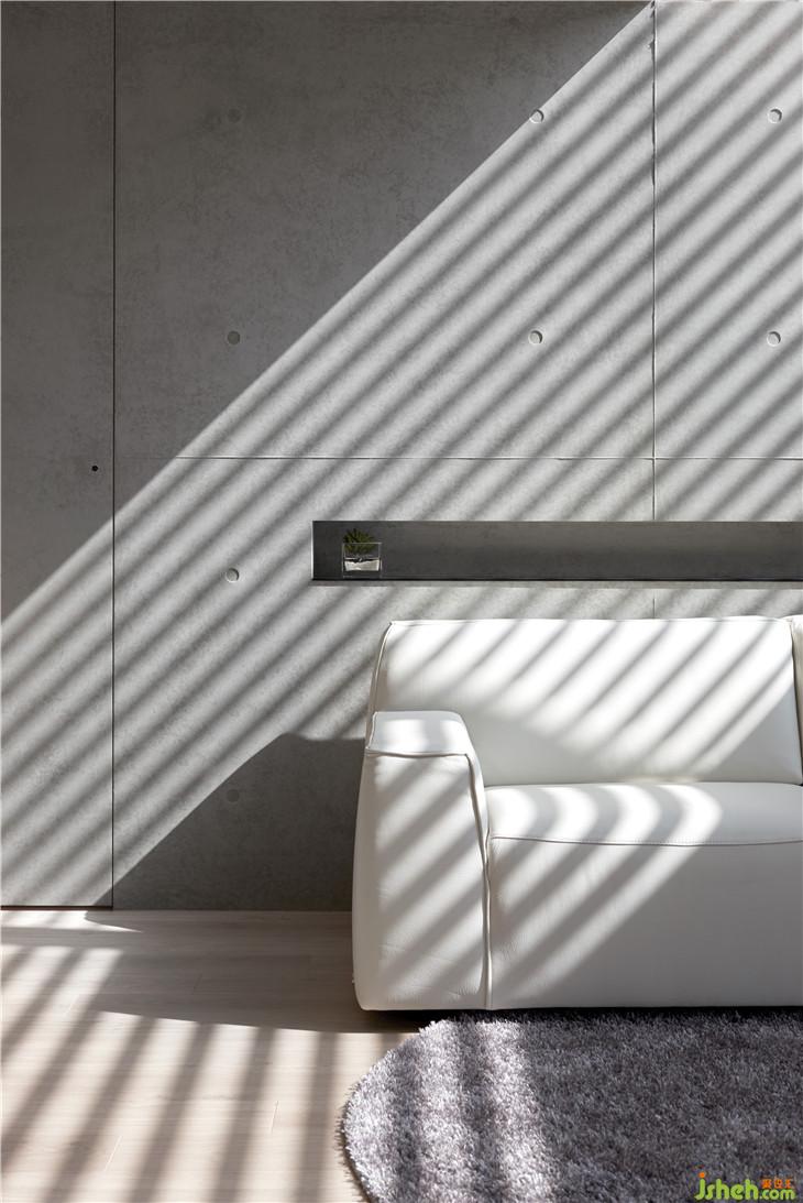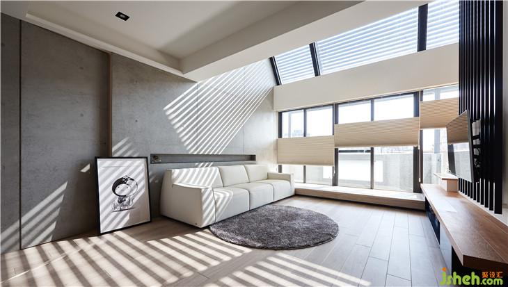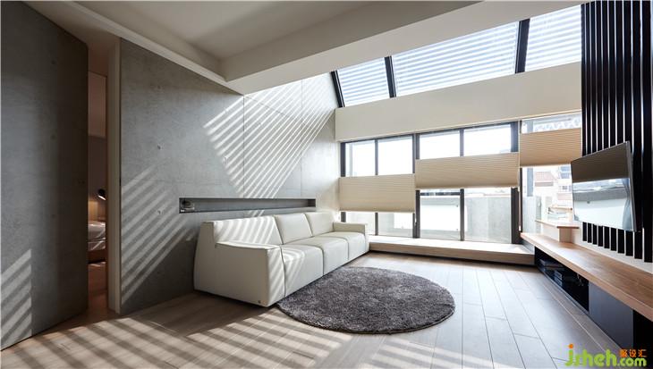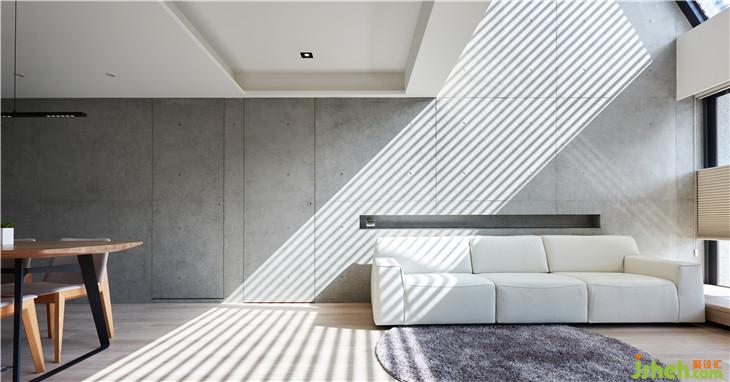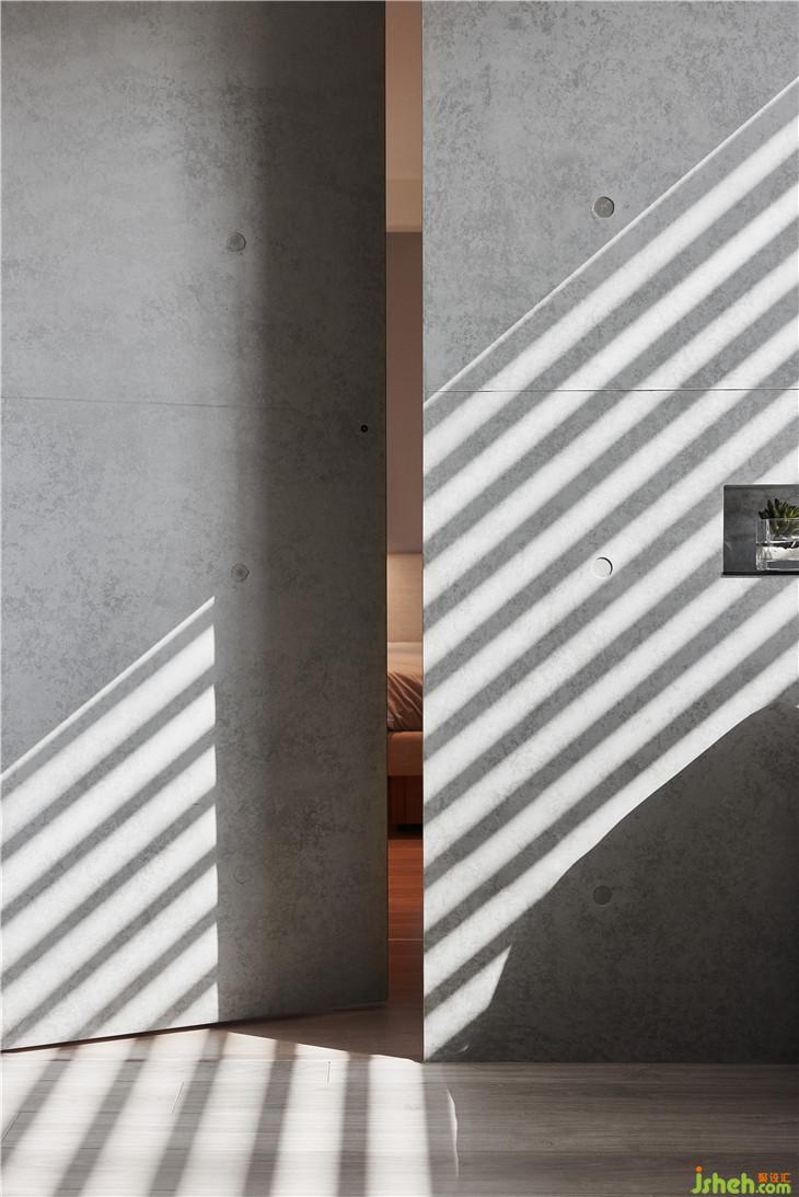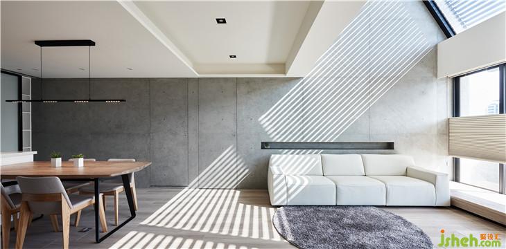 空間的生命力是藉由人、光線、生活所組成,因為有光線,所以人在這里生活著。我們在這復層空間內(nèi)設計斜面的天窗,將陽光引導到室內(nèi),陽光因為不同時間點,經(jīng)由玻璃的折射而有不同光影變化,空間也會隨著不同光影產(chǎn)生不一樣的立面表情。 我認為光影才是空間中最美的擺飾,空間中貫穿上下樓層的清水模墻面就是最美的畫布,似乎在述說著這個空間的故事。