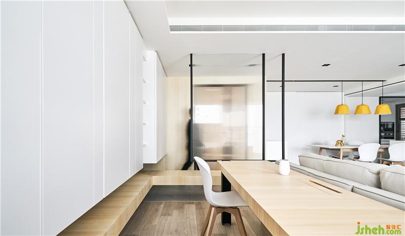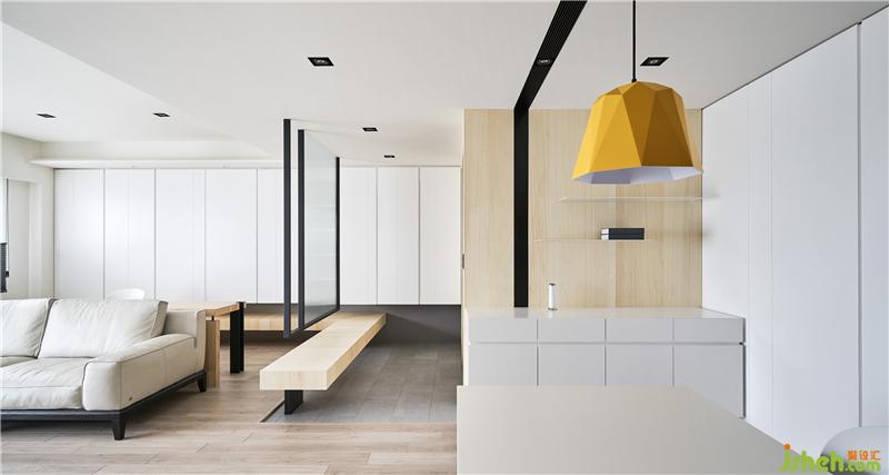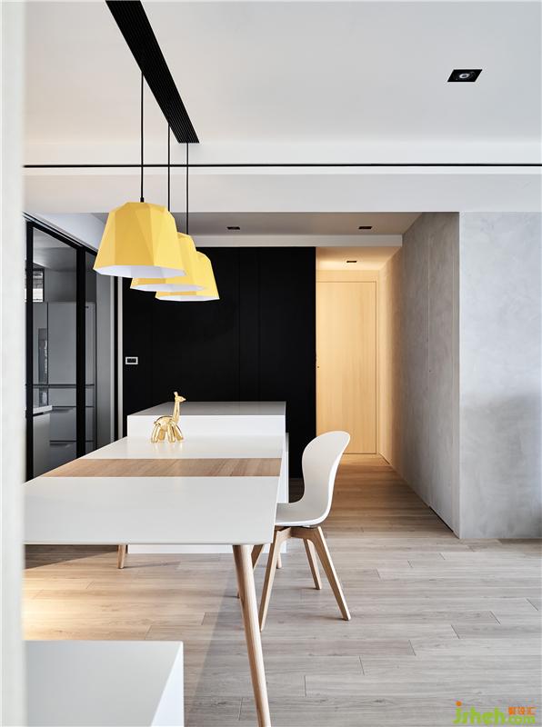 屋主是一位律師,平時(shí)工作壓力很大,所以我們決定讓整個(gè)空間都是以白色系為主,色彩心理學(xué)上,白色象征純潔、干凈、信任,很符合屋主工作的專業(yè)形象,而為了避免太大面積的白色會(huì)讓人有開放的疏離感,所以適時(shí)地穿插木頭及局部灰、黑色點(diǎn)綴,平衡視覺感受。室內(nèi)設(shè)計(jì)師