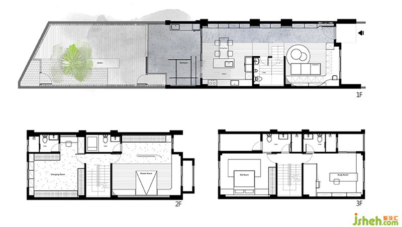 一樓為主要活動(dòng)空間,我們?cè)谕ピ号赃吀袅艘婚g鳥屋,庭院可以讓狗狗在這裡跑跑跳跳曬太陽;二樓是主臥室跟超大更衣室;三樓為書房及夾層閣樓還有客房。三樓因?yàn)闉樾蔽蓓?,所以我們就在?chǔ)藏室上面設(shè)計(jì)了一個(gè)小閣樓,平??梢栽谶@裡放空或看看書的好角落臺(tái)灣裝修設(shè)計(jì)。