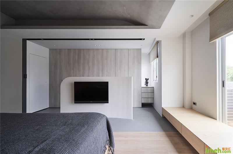 主臥室因?yàn)樵猩疃缺容^深,所以我們把電視牆往前拉,后方可以坐個(gè)簡(jiǎn)易的衣櫥空間,地板部分用木紋磚及義大利礦物涂料做界定;天花板延續(xù)一樓的弧形穴居概念,床頭板也呼應(yīng)天花板造型,用一個(gè)弧形木皮牆面修飾;窗邊則設(shè)計(jì)了一個(gè)加寬臥榻與床頭柜整合臺(tái)灣裝修設(shè)計(jì)。