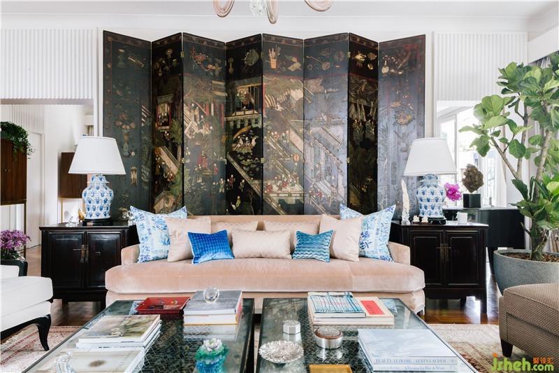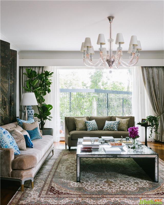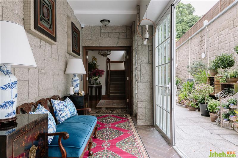 玄關區(qū)艷麗的波斯地毯,注入這棟老宅空間新的活力,換鞋椅的那抹艷藍色和地毯的玫紅有了強烈的沖突感,這種沖突感所組成的驚艷,讓并列兩旁描金的古董裝飾柜也有了生機和活力,青花瓷的臺燈和抱枕有了輕輕的互應,中西之美在并不大的玄關區(qū),有了這么多的內(nèi)容交措,所呈現(xiàn)SCD最善長的混搭手法;倚在門廊上的白色鸚鵡,和門外自然堆起的綠植花藝,滿滿的生活情趣和氣息。設計公司