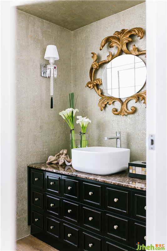洗手間將中西方元素進行了很好的融合,歐式溜金復(fù)古鏡,和Bacarat的鏡前燈映襯出西方元素里最經(jīng)典的部分,中式藥柜概念的洗手盆柜,將收納功能與東方元素很好的契合到恰到好處,洗手間墻壁運用了貝殼元素的墻紙,在沒有濕區(qū)的客衛(wèi),是大膽而特別的設(shè)計手法。設(shè)計公司
