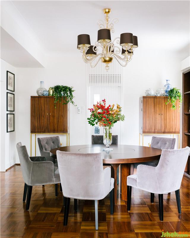 幾何感地面拼花的木地板,在棕黃的漸變中和Baker的兩個高柜及餐桌有了巧妙的聯(lián)合,潔白而簡潔的墻面,餐桌上的鮮花和高高佇立在兩個高柜上的綠植相互呼應(yīng),給餐廳注入了清新的生活氣息與活力,精致的歐式玻璃吊燈與銀灰色天鵝絨簡歐餐椅搭配點綴了原本單調(diào)的空間,Barker高柜上隨意擺放的青花古董花瓶隱隱彰顯餐廳文化內(nèi)涵,這也是SCD所追求的設(shè)計方式:奢侈而不浮夸。