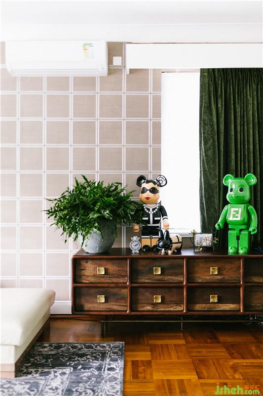 淡淡的米白色方格搭配白色邊框的幾何形圖案墻紙,Norhor經(jīng)典美式鄉(xiāng)村風(fēng)格的古銅色邊柜上搭配兩個調(diào)皮個性的Fendi和Chanel限量版公仔玩偶,是時代審美演變下的新式體驗,悄悄形成了一道獨特的空間場景,使原本素凈的老宅充滿趣味性,生活美不該是沉悶而充滿統(tǒng)一感,而是在文化氣息的氛圍下的內(nèi)斂與時代同步的時尚。
