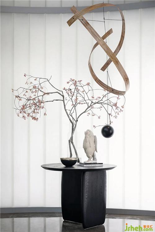 入口接待處的長凳猶如嶙峋的怪石,搭配清透如水的茶幾,一虛一實,與窗外華陽湖的翠綠,宛如天然的畫卷,沁人心脾。藝術(shù)有時候是一種抽象的精神姿態(tài),是一種主觀的感受。
