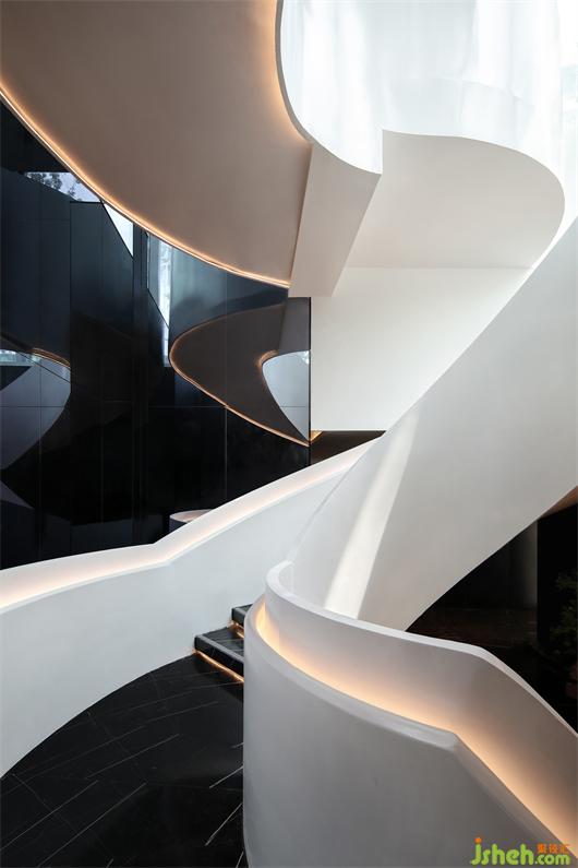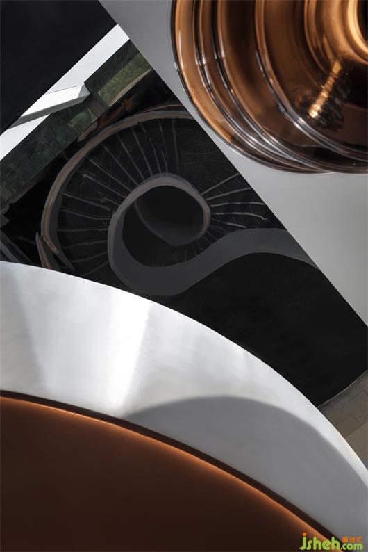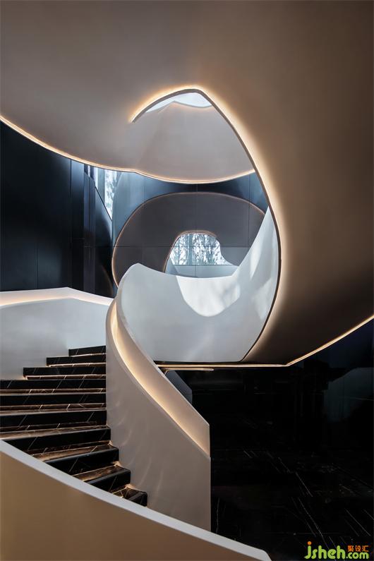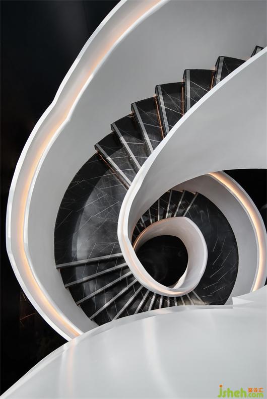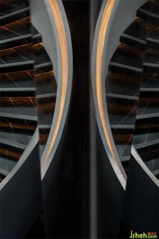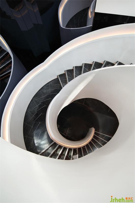 走過庭院式景觀道,經(jīng)步梯來到地下層進(jìn)入接待前廳,旋轉(zhuǎn)的藝術(shù)樓梯讓場(chǎng)景不止局限在一個(gè)維度,它是兩個(gè)維度之間游動(dòng)而搖曳的聯(lián)系點(diǎn),串聯(lián)起所有的材質(zhì),統(tǒng)一了建筑的體塊感與連續(xù)性。設(shè)計(jì)師杜恒對(duì)人們進(jìn)入空間后的一眼難忘有著執(zhí)念般的追求,她喜歡用不同迷人材料的可能性去組合創(chuàng)造層次豐富的幻境感。
