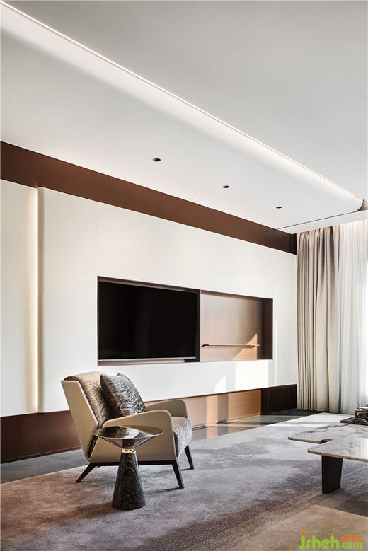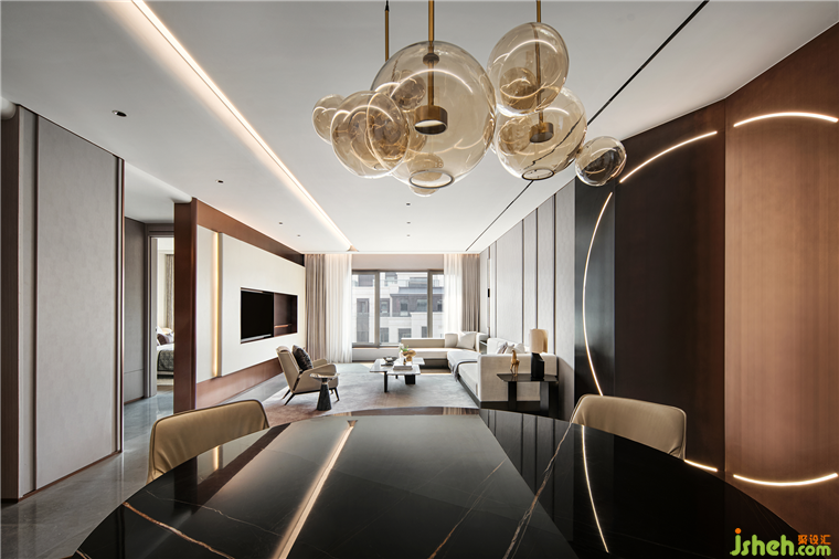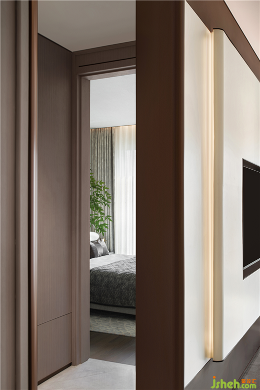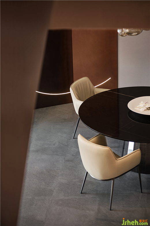 從客餐廳過渡到臥室及書房,空間的穩(wěn)重感逐漸增強(qiáng),冷靜而情感細(xì)膩的調(diào)性,而這一切,無需張揚(yáng),豪宅設(shè)計(jì)只需以簡(jiǎn)馭繁,靜默喚醒;無論是日間穿透窗戶自然的光線,還是夜間氛圍柔和的照明情景,無論是與家人聚會(huì)聊天,還是獨(dú)自休憩放松。