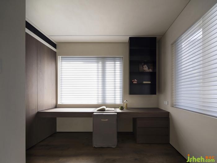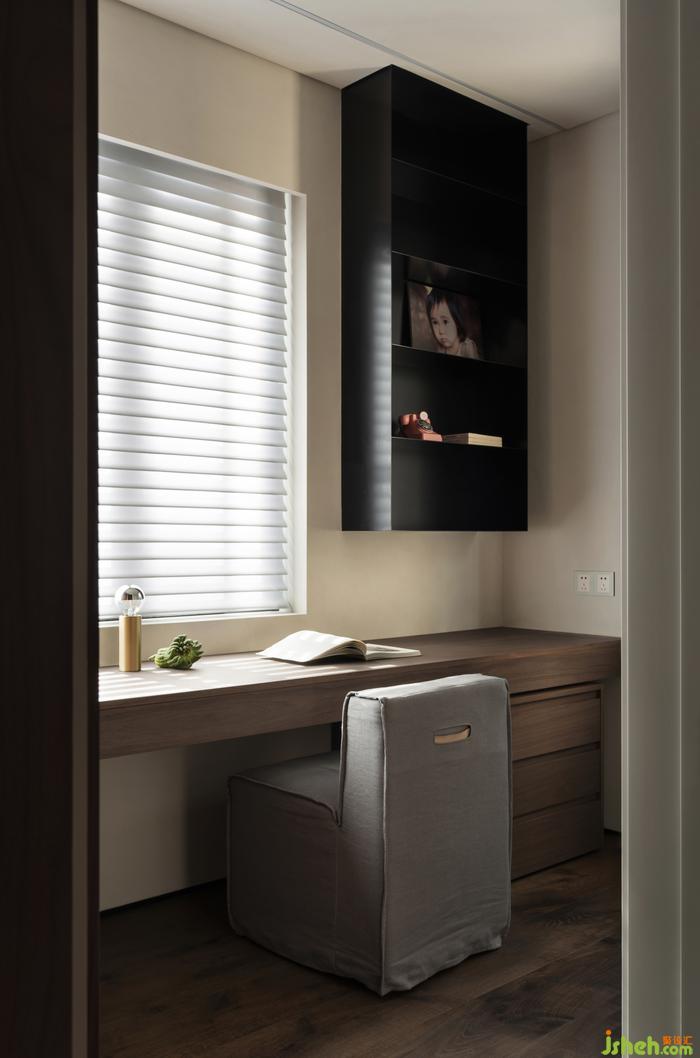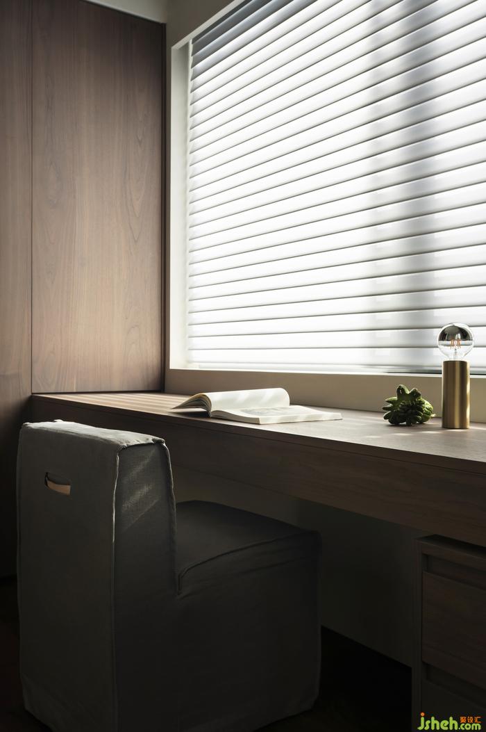 被胡桃木包裹著的走廊,陽光透過百葉窗簾,光影搖曳,定格溫暖。