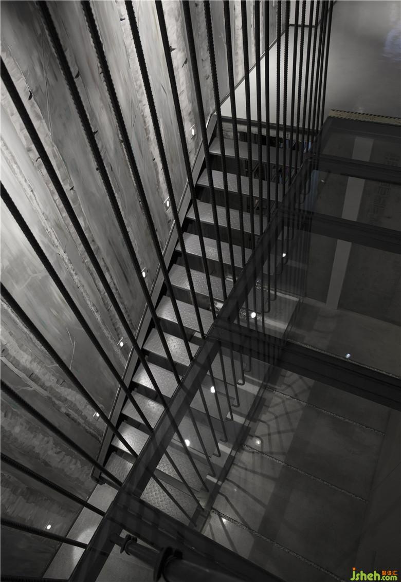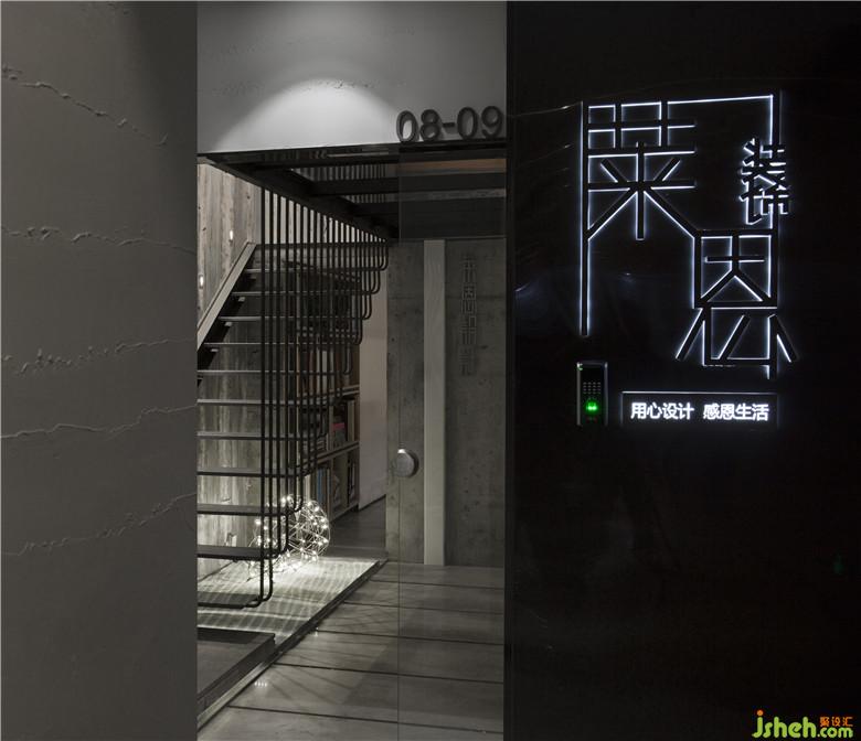 入戶門隨機的白色膩子底像一層層的波浪,同時與入戶玄關(guān)的白色燈帶和景觀沙池形成呼應,辦公室設計的黑鈦門框及LOGO背板又和工業(yè)風的黑色不銹鋼樓梯、玻璃棧道、以及玄關(guān)的建筑原墻和地面的灰色麻面大理石磚形成一個整體。