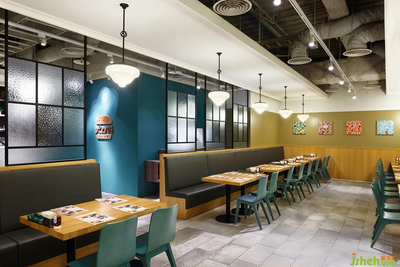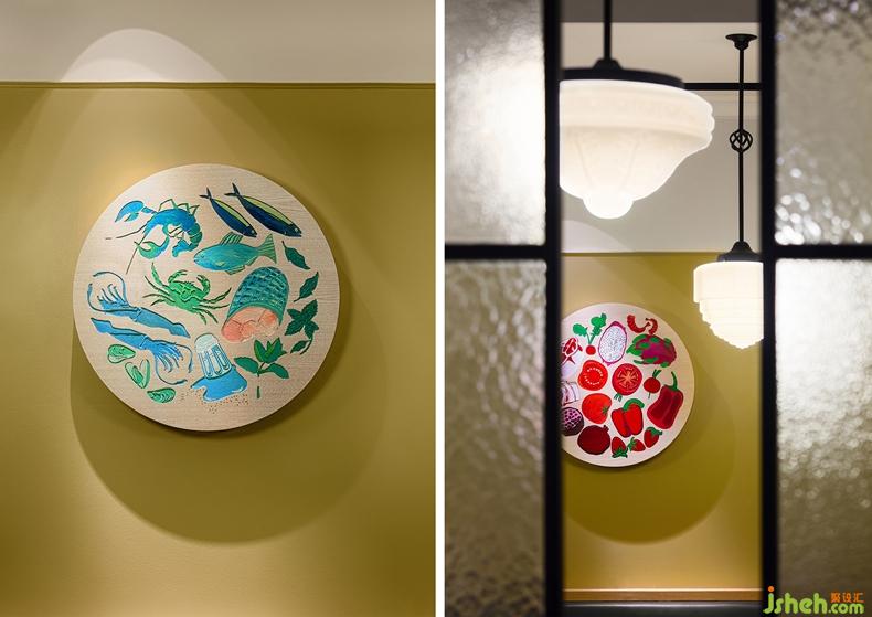 餐廳壁面的裝飾品選擇色彩繽紛、趣味圖案有蝦子、魚、西紅柿、青椒、三明治、漢保、奶昔杯…的素材,傳達具有豐富多樣的料理,并散播歡樂愉快的用餐環(huán)境。餐廳設(shè)計