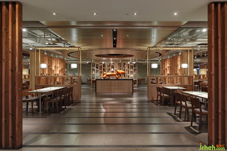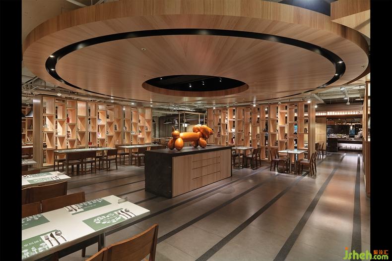 入口處以代表餐廳主題的飾品擺設(shè),一目了然的食材做為入口意象的視覺(jué)交點(diǎn),除了吸睛以外,也清楚地表達(dá)蔬食的核心概念。餐廳中央的同心環(huán)狀似乎傳達(dá)的凝聚的氛圍,搭配具古典歐風(fēng)的廚房擺飾,兩者混搭的結(jié)果,無(wú)疑給視覺(jué)全新的感受。