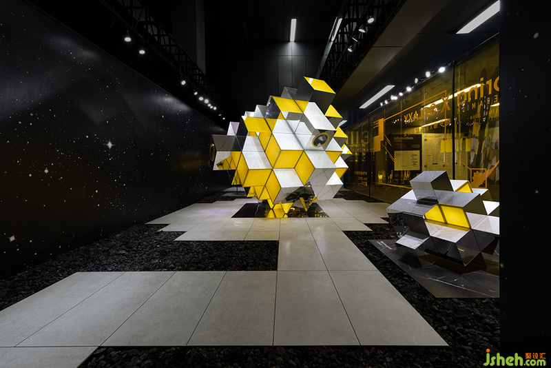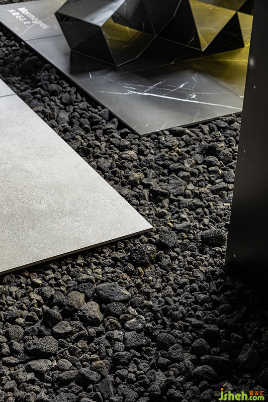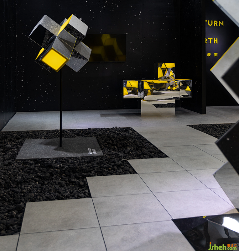此外,設計師運用繁星閃爍的太空畫面作為背景,而在地面的瓷磚步道之間鋪滿了火山巖顆粒;配合有意壓暗的場內燈光,著力營造展會之中的異次元體驗。