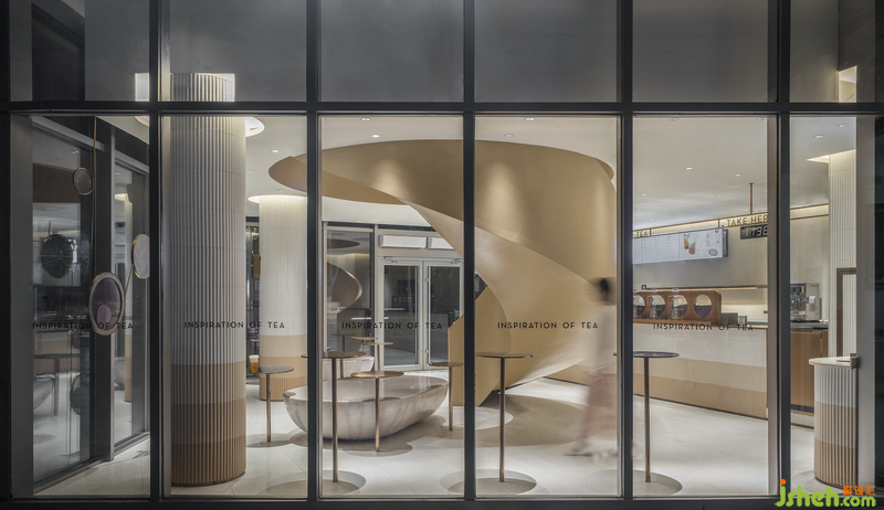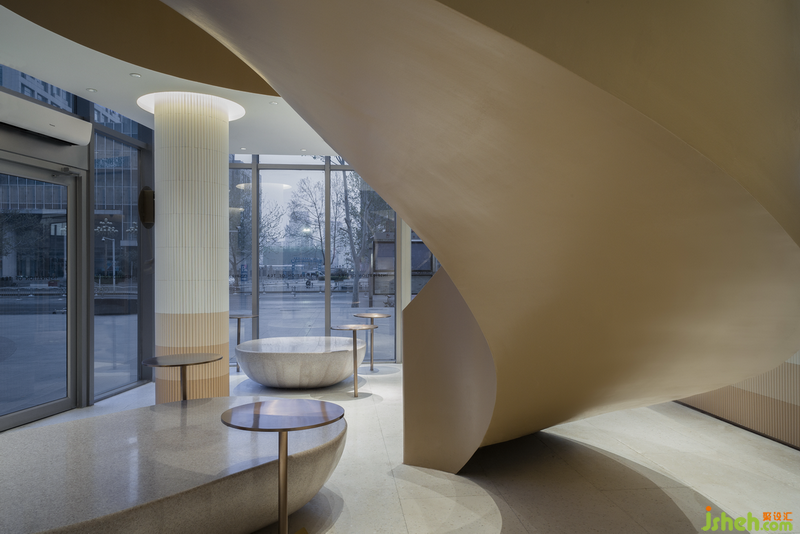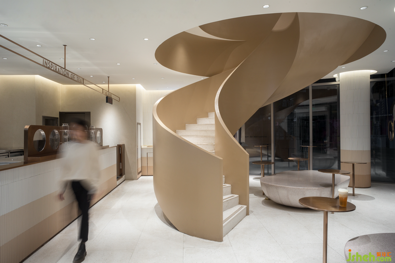 旋轉(zhuǎn)樓梯是空間中的主角,人們在店內(nèi)的活動圍繞著它進行,它也成為顧客們喜愛的拍照背景甚至到店原因。