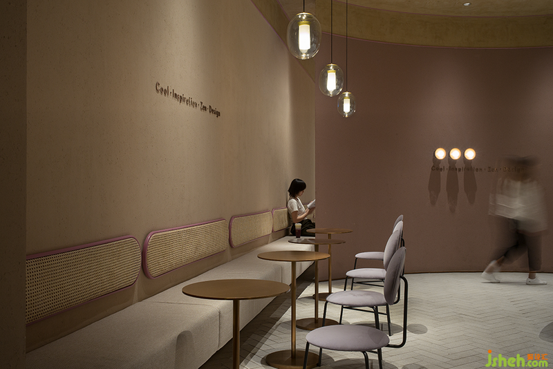 麻石磚以復(fù)古人字拼接方式呈現(xiàn),藤編與麻布質(zhì)感則帶來(lái)傳統(tǒng)東方庭院的聯(lián)想。墻面所用定制手工磚上的墨點(diǎn)圖案由制磚師傅隨機(jī)潑墨而成,每塊獨(dú)一無(wú)二的磚都擁有同樣光滑親膚的觸感。