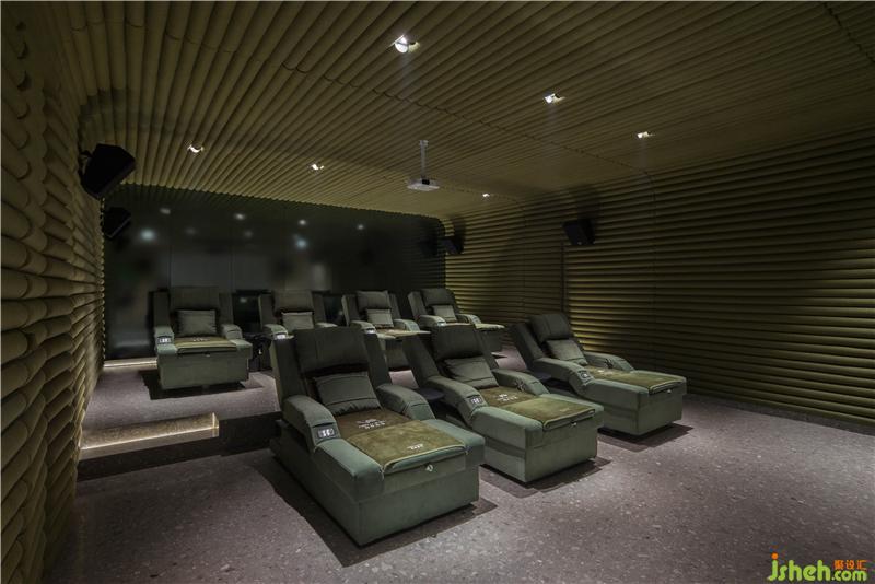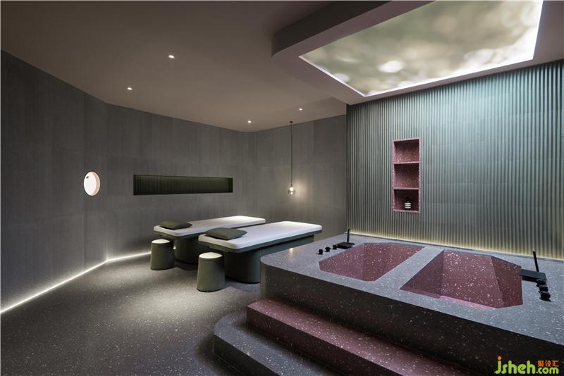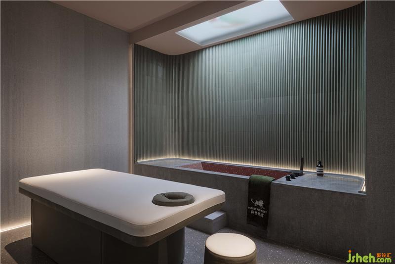 △SPA房的浴池上方使用磨砂玻璃,內(nèi)嵌LED屏幕持續(xù)播放樹蔭斑駁的光影動態(tài)效果。