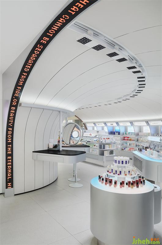 護膚區(qū)的主題島臺通過規(guī)整的陳列道具,渲染專業(yè)化的實驗場景,增加消費者對產(chǎn)品成分的信任感。