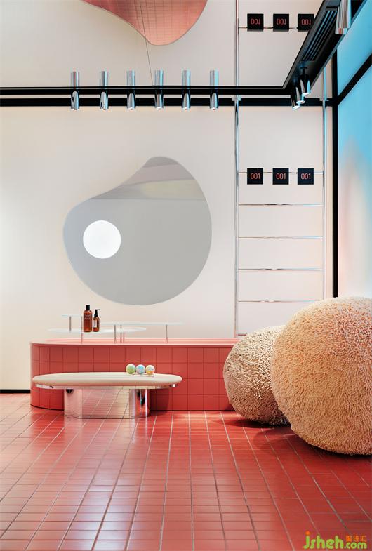 原先隱蔽的拐角區(qū)域被改造為主題體驗區(qū),根據(jù)喜燃的選品策略定期進行主題區(qū)域設(shè)計。目前該區(qū)域作為浴室主題區(qū),體驗店設(shè)計使用復(fù)古紅色防滑地磚、大浴球、浴缸和花灑等一系列道具,模擬浴室環(huán)境。浴室主題區(qū)同時也是店內(nèi)最大的商業(yè)綠洲點,可以讓逛累了的顧客在此稍作休息。