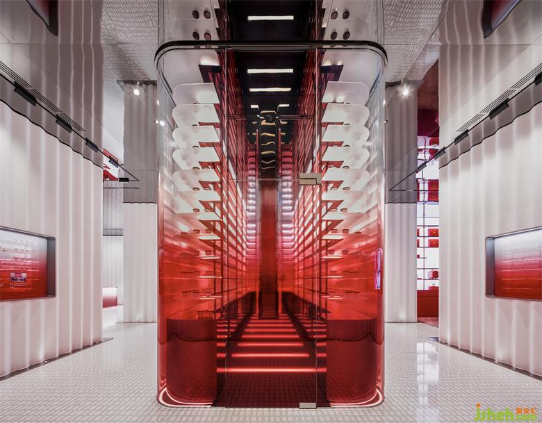 旗艦店設(shè)計(jì)項(xiàng)目選址北京華貿(mào)商圈的核心商業(yè)地段,比鄰SKP購(gòu)物中心,由一棟三層高的舊商業(yè)建筑改造而成。設(shè)計(jì)師利用U型玻璃對(duì)整體建筑進(jìn)行包覆,打造均一的外立面表皮,再置入多媒體動(dòng)態(tài)燈光,呈現(xiàn)白里透紅的燈光效果,在商圈場(chǎng)景中形成帶有品牌宣傳意義的可視媒介。