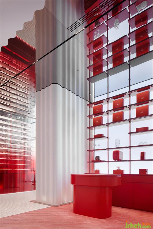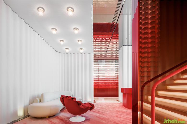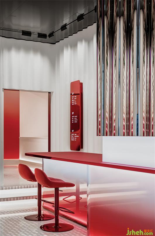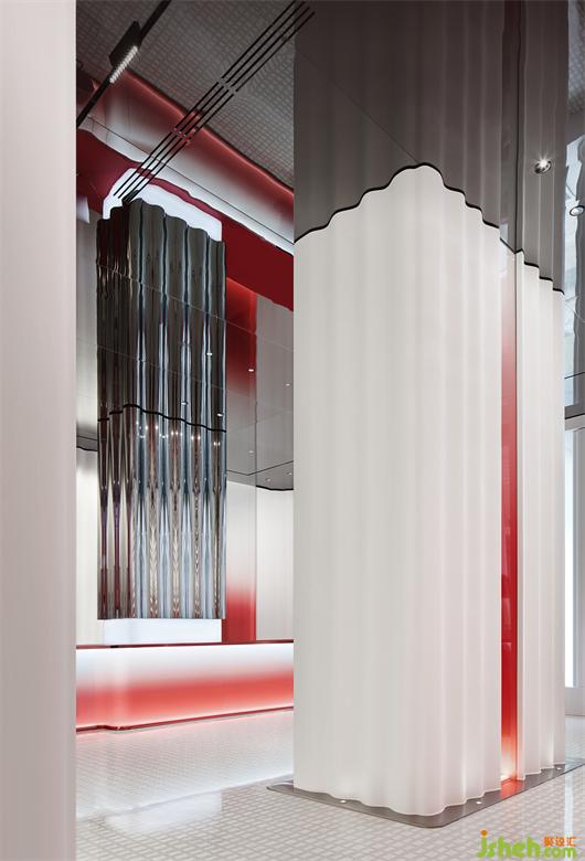 一層接待區(qū)柜臺正好被一根巨大的柱體插入,采用亮面波浪形態(tài)金屬包覆后,柱子被賦予了雕塑感,打破了空間的秩序,形成有趣的反差。