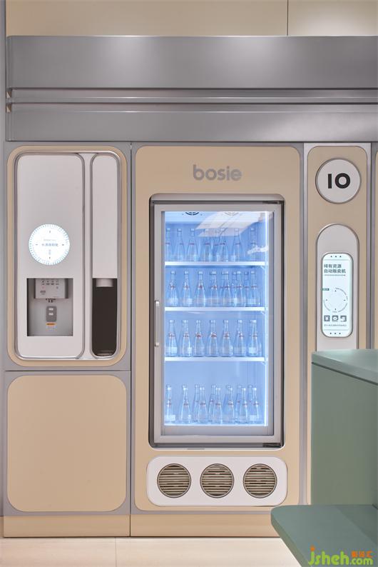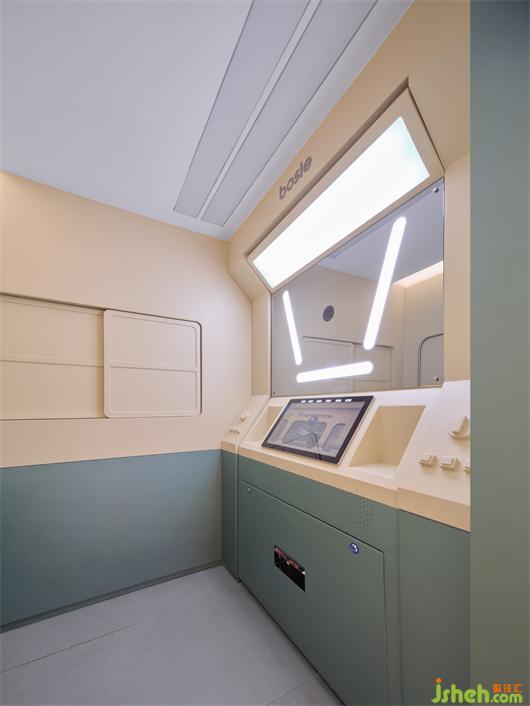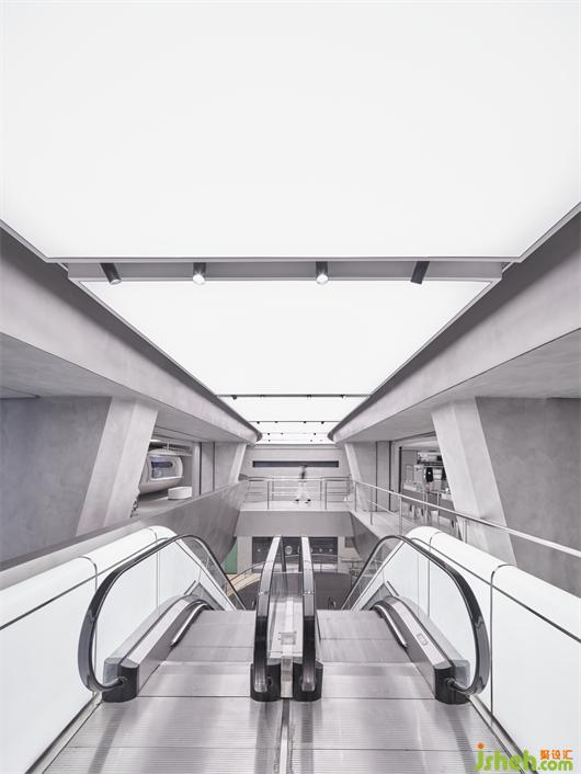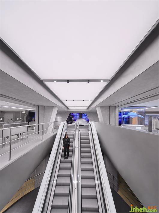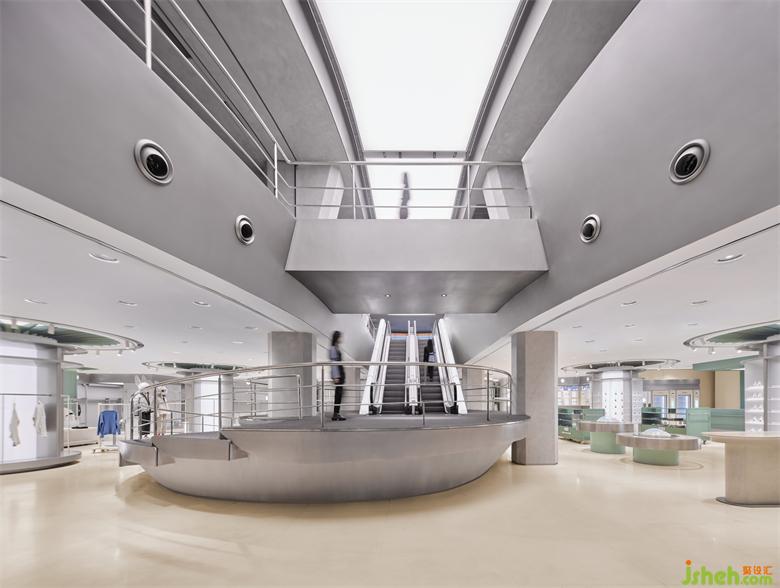 主體造型有著20世紀(jì)中葉粗野主義建筑的典型特征,復(fù)古科幻的太空風(fēng)格成為整個(gè)空間的底色。旗艦店設(shè)計(jì)弧形階梯平臺設(shè)計(jì)規(guī)避了扶手梯下方沉箱難題,又與發(fā)光扶手梯相連,通過屋頂柔軟的光源與大型金屬建筑體塊形成矛盾反差,營造通往另一個(gè)空間的神秘昭示。