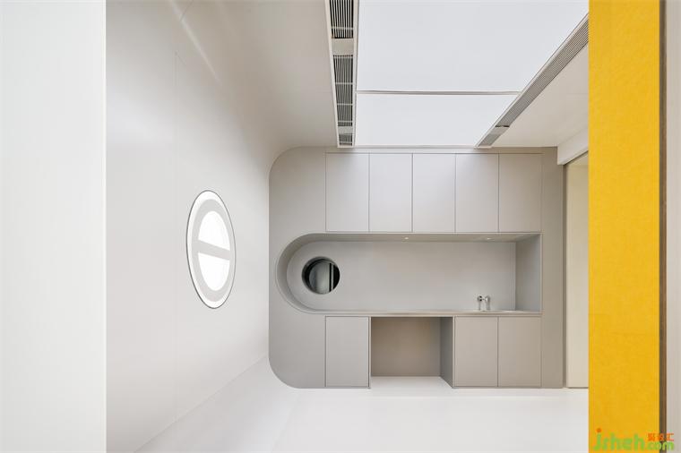 在空間動線的末端,設(shè)計師不忘緊扣腳本,將消費者帶入到故事腳本的高潮部分。設(shè)計師巧妙地將品牌的植物IP以裝置藝術(shù)的設(shè)計手法融入狹長的回廊中,通過動態(tài)燈箱模擬植物在實驗室中場景,裝修設(shè)計光源的閃動模擬植物呼吸的韻律,展現(xiàn)出植物蓬勃生長的強大能量。在沉浸式的場景中,消費者潛移默化地將植物的生長律動與品牌強調(diào)的天然純粹進行聯(lián)想,裝修設(shè)計從而對品牌有了更清晰和深入的感知。