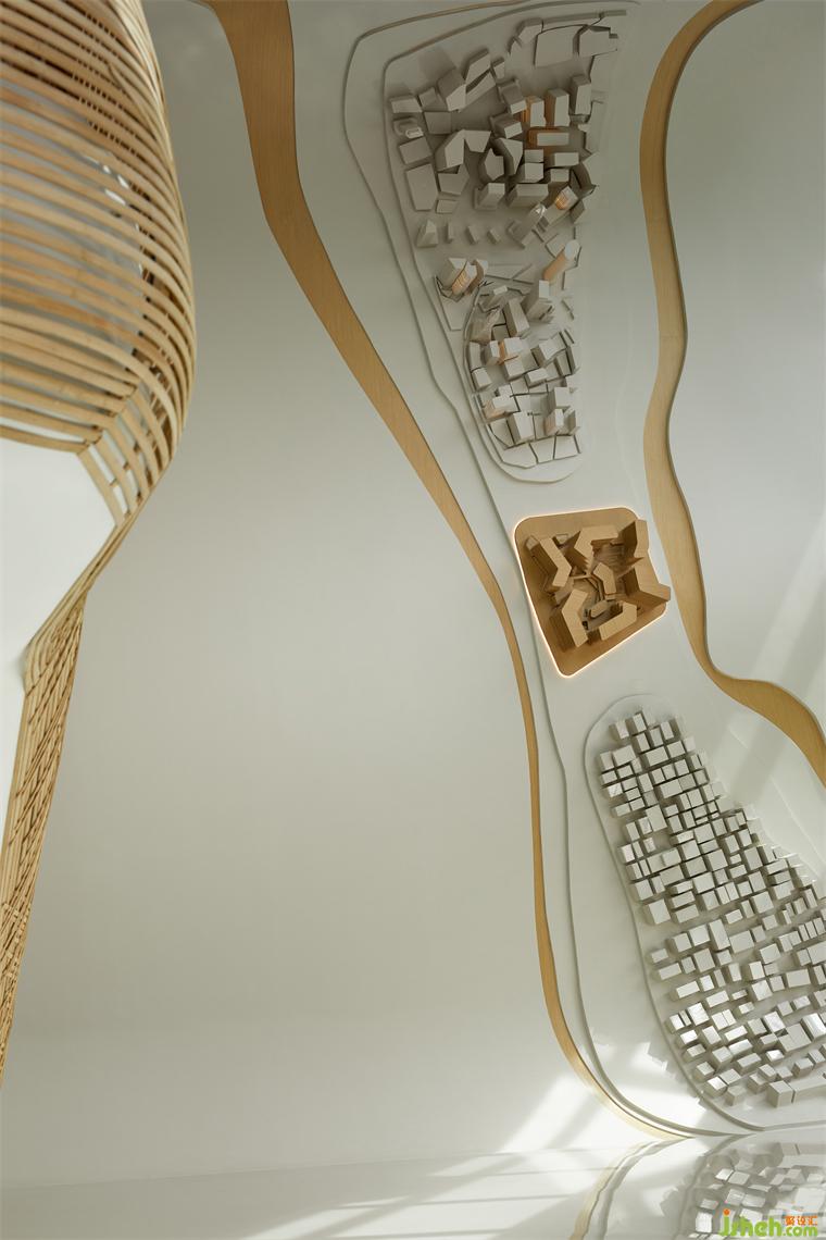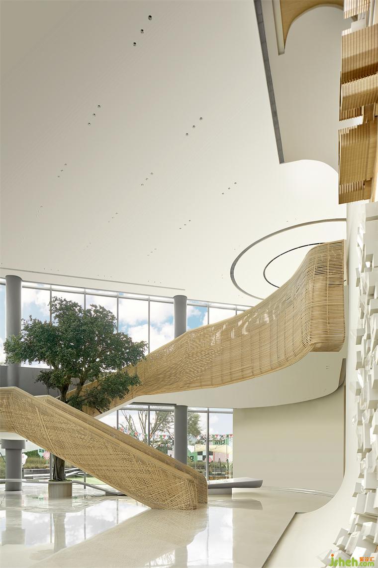 連接上下兩層空間的樓梯由工人在現(xiàn)場以白竹片手工編織而成,代表未來的白竹,裝修設(shè)計也呼應(yīng)榕樹根莖和榕須的生生不息,當清晨的陽光逐漸照亮展廳,竹編樓梯散發(fā)出溫潤的力量。