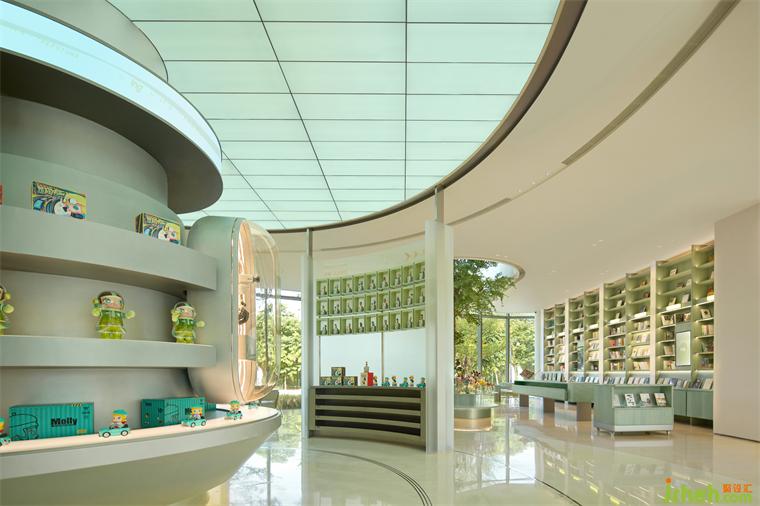 潮玩雜貨區(qū)提取樹的形態(tài),結(jié)合天花燈膜形成樹狀陳列柱,裝修設(shè)計加入符合年輕人審美的潮玩,聚集有著同樣喜好的群體。另外,我們嘗試把社區(qū)公共空間設(shè)計得更像一個家,注入閱讀、花藝、咖啡,為年輕人提供安全感和生活小確幸。