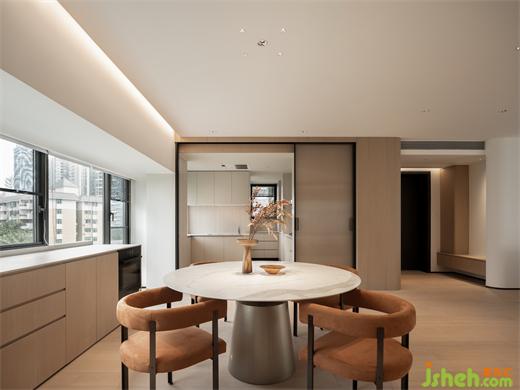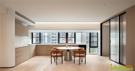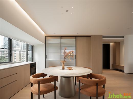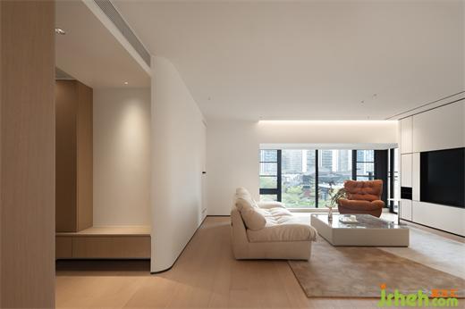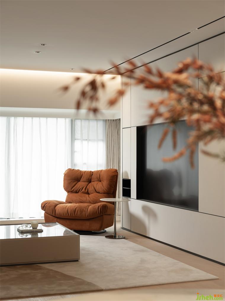 低飽和基調(diào)自帶淡雅的高級感,一抹橙褐色仿佛是玉蘭花蕊,高雅清新且富有生命力 。電視背景墻的設(shè)計是在結(jié)合功能需求后,家裝設(shè)計以勾縫分割的手法創(chuàng)造出大小不同的體塊,比例協(xié)調(diào)不失美感;走廊泛照明撇棄以往天花燈槽的做法,簡化造型,豎向補光。在光的映襯下,空間設(shè)計手法顯得十分克制卻不失豐富的細節(jié)考量。