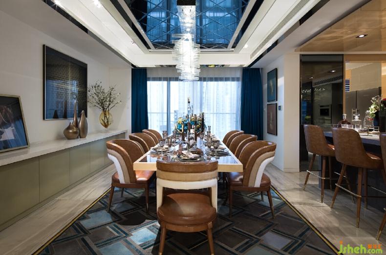 藍(lán)色的家具軟裝為淺色的空間醞釀出浪漫矜貴的格調(diào),唯美的藍(lán)素將浪漫與高壓的法式風(fēng)格渲染到極致;客廳的典雅延續(xù)至用餐空間,中性色與金色、深藍(lán)的結(jié)合,彰顯其高貴品位及氣質(zhì)。