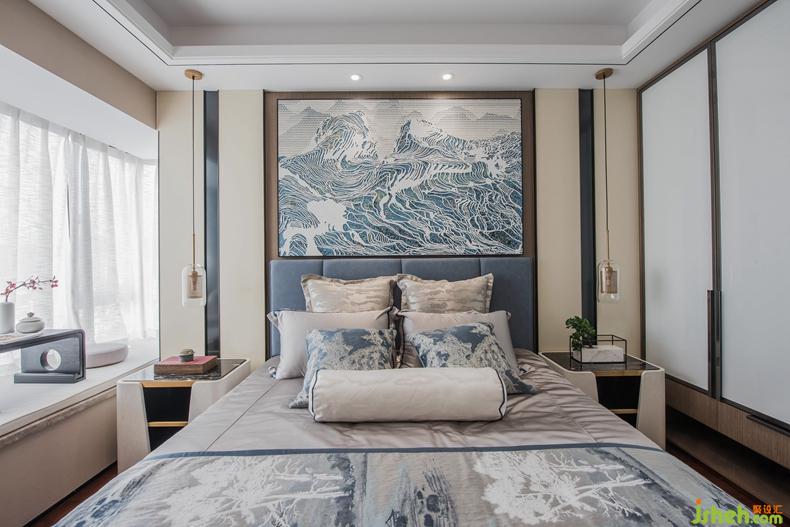 臥室設(shè)計(jì)上,將自然山水的景色引入空間,在現(xiàn)代生活的環(huán)境中結(jié)合東方美學(xué)底蘊(yùn),意在“一卷代山、一勺代水”,令空間居住者自然代入“物象因視覺成景,景因心悟而成境”的無(wú)相、萬(wàn)象空間。