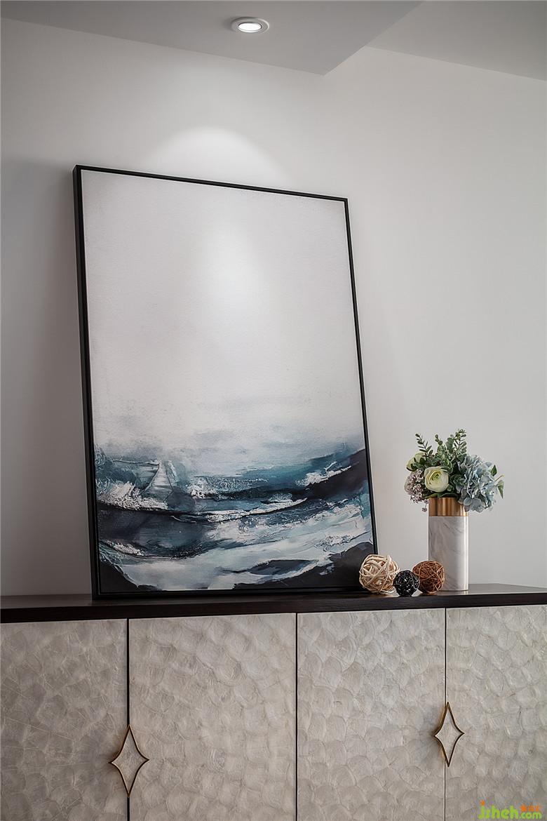 門廳處,手工創(chuàng)作的海浪抽象擺畫和貝殼面材質的裝飾柜仿佛帶來了一絲海風的清冽。