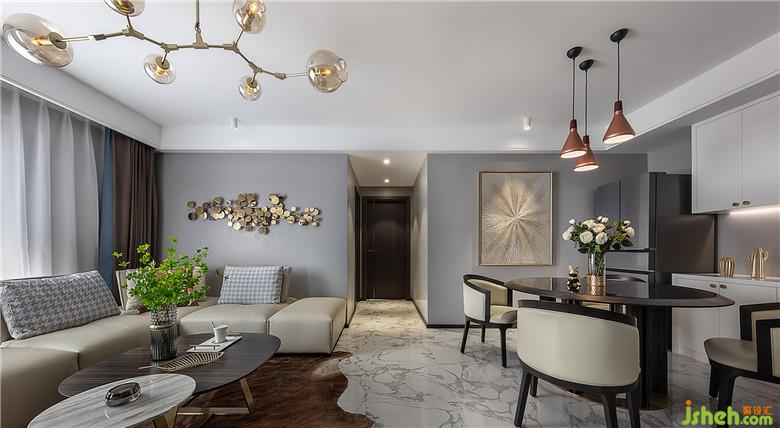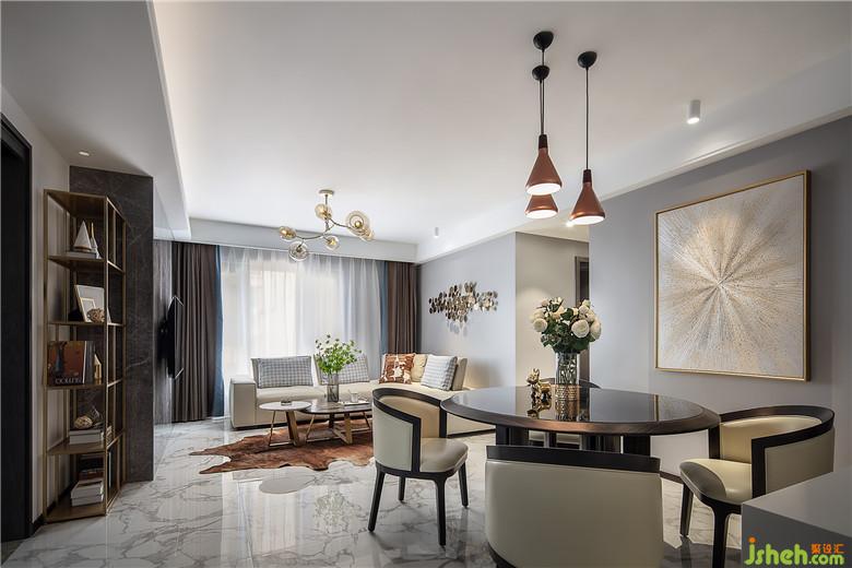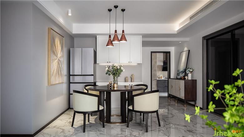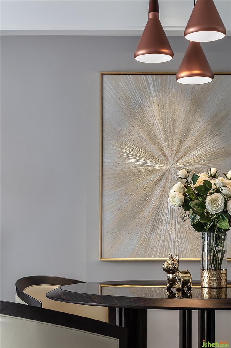 餐廳墻面的金色放射狀抽象畫和銅質的吊燈,也給整個用餐區(qū)域增添了一些貴氣。