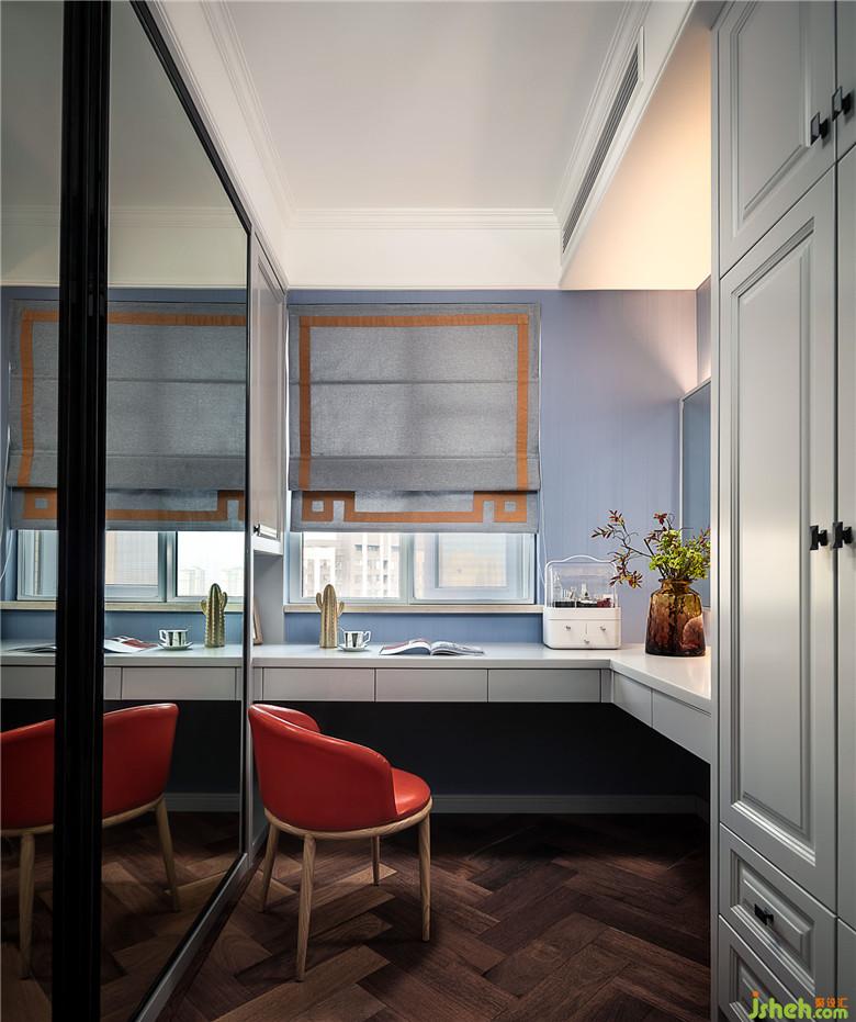 衣帽間與化妝間,柜子上的鏡子移門很好的擴充了空間,整裝也變得簡單隨意。鋪上瑜伽墊,這里是一個完美的瑜伽房。橘色的椅子為這個生硬的空間增添了一抹動人的色彩。