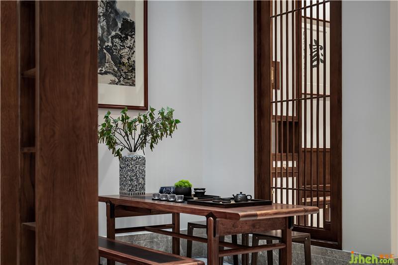 ▲透過一扇木質(zhì)屏風營構的框景,感受到茶室的脈脈禪意。干凈利落的空間處理與傳統(tǒng)的中式裝飾映襯對照,墻面的刻意留白,搭配棕色的實木材質(zhì),清新不失端莊之韻,還原簡樸寧靜利落之美。