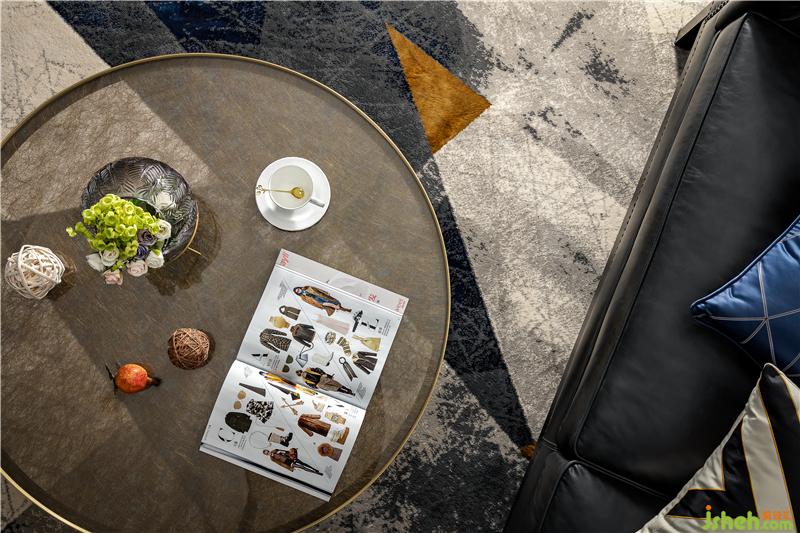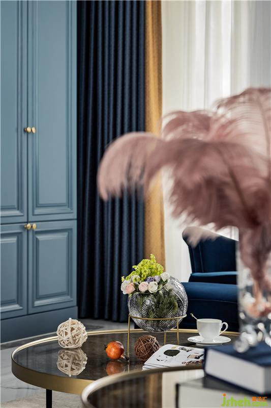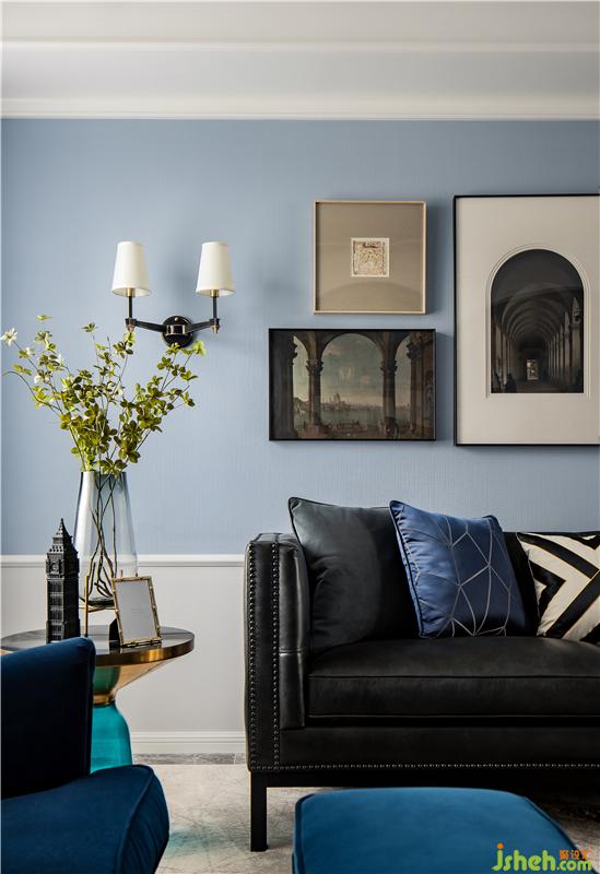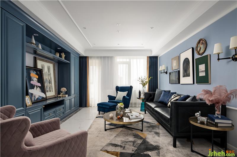 ▲而點(diǎn)綴其中的灰粉單人沙發(fā),亮藍(lán)玻璃邊幾,茶色玻璃茶幾,INS復(fù)古風(fēng)的掛畫(huà),切割花紋的地毯……則帶出了一絲活潑時(shí)尚的意味。
