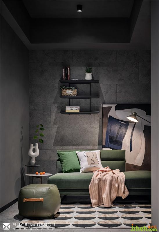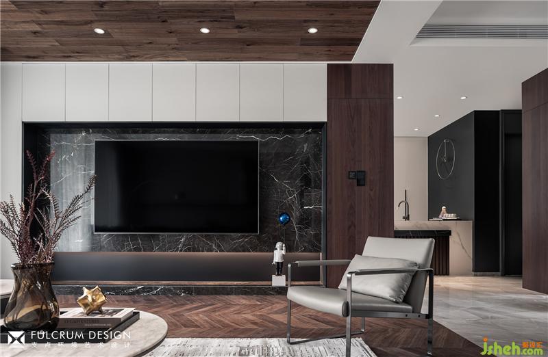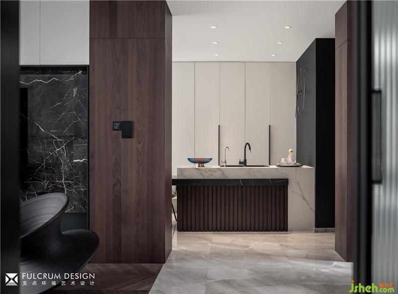 深色山文木飾面與黑色亮面石材的肌理對(duì)比,走廊處遠(yuǎn)景的黑白對(duì)比,顯得整個(gè)3樓層次感非常豐富。